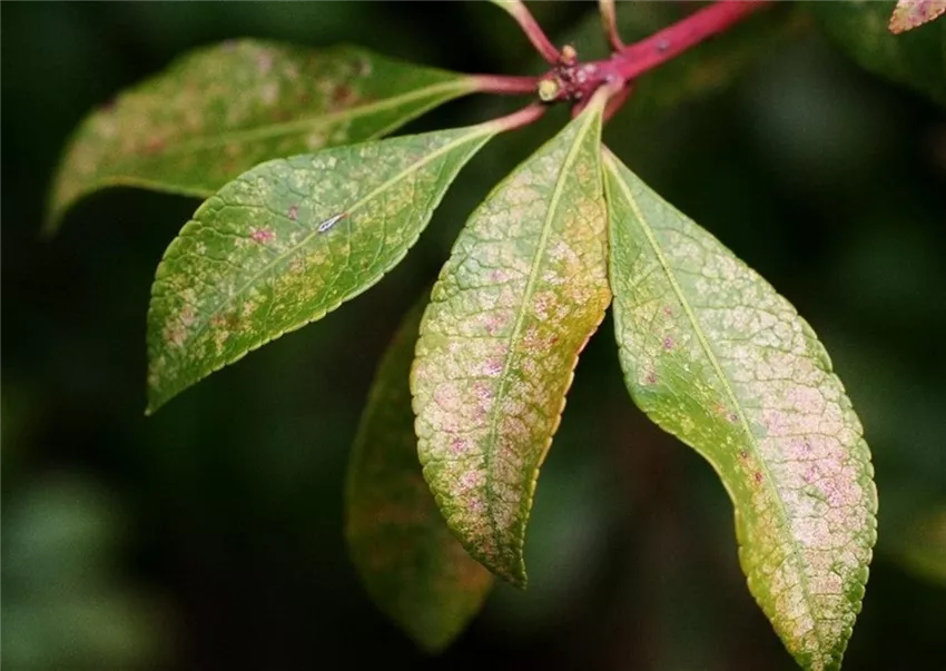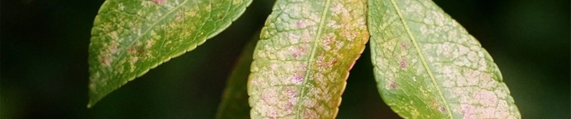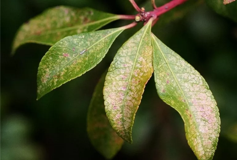 Die Blätter zeigen gesprenkelte Aufhellungen. Mit fortlaufendem Befall nehmen diese Aufhellungen, die aus einer Vielzahl von Einstichstellen bestehen, zu, so dass die Blätter fahl-gelb bzw. hellbeige erscheinen.
