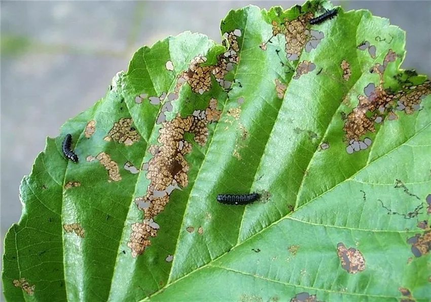 An den Blättern fressen schwarze Larven und metallisch dunkel- bis schwarzblau gefärbte Käfer.
