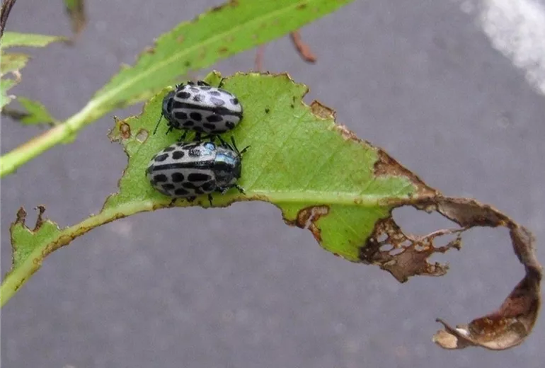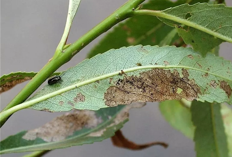 Im Frühjahr verursacht der so genannte Weidenblattfloh, ein kleiner metallisch glänzender Blattkäfer, Lochfraß an jungen Blättern.