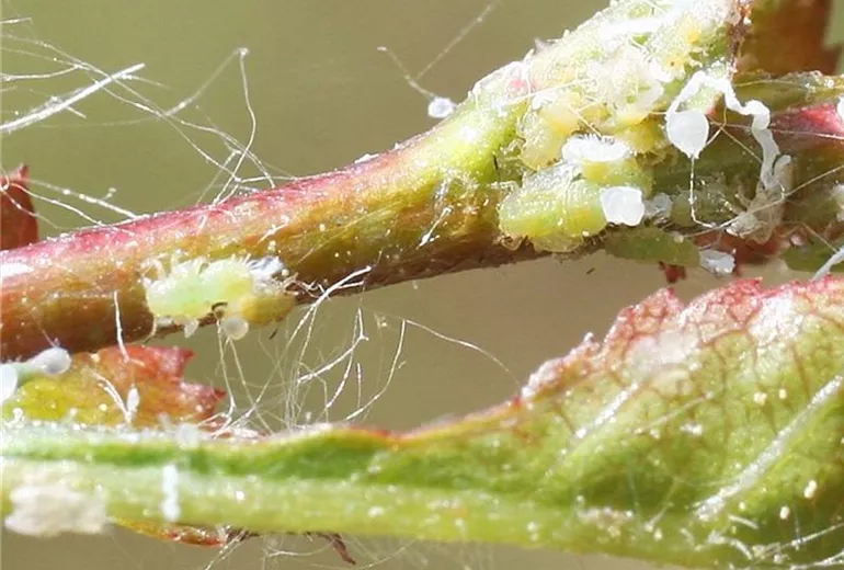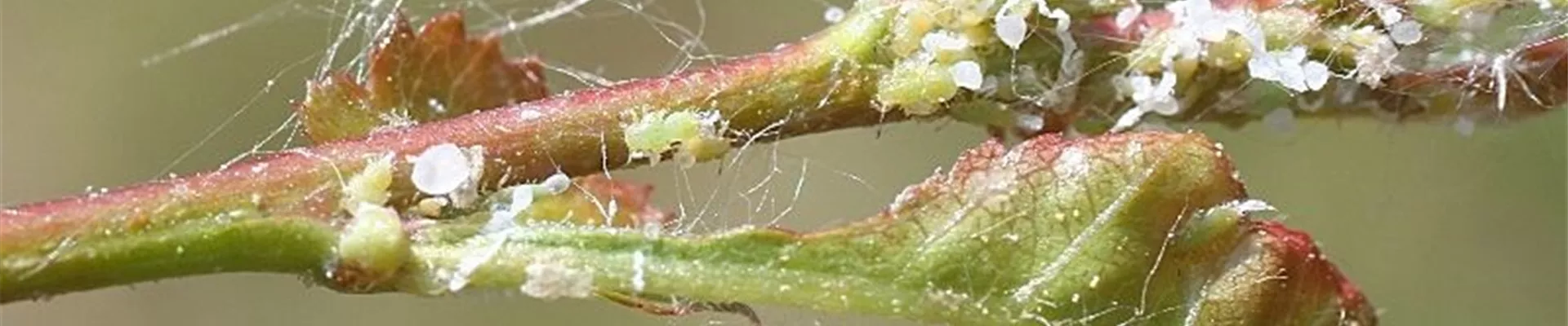 Durch die Saugtätigkeit kann es zu rötlichen Verfärbungen der Blätter kommen. Bei starkem Befall sterben die jungen Blättchen auch teilweise ab.