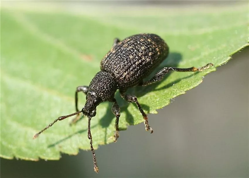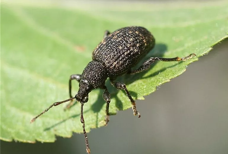 Der Dickmaulrüssler (Otiorhynchus sulcatus) gehört zur Gruppe der Rüsselkäfer. Die grauen, ca. 1 cm langen Käfer fressen bei Dunkelheit an den Blättern verschiedener Gehölze und Stauden.