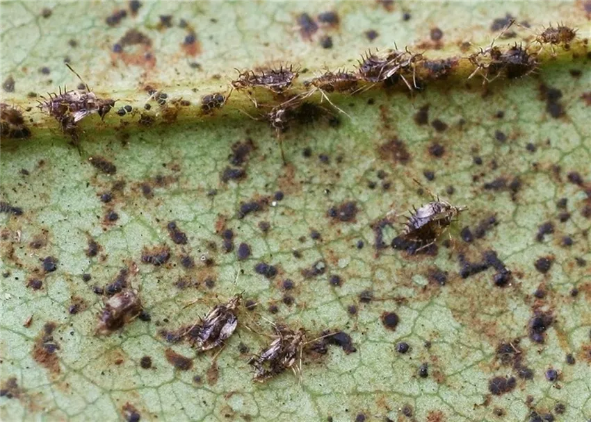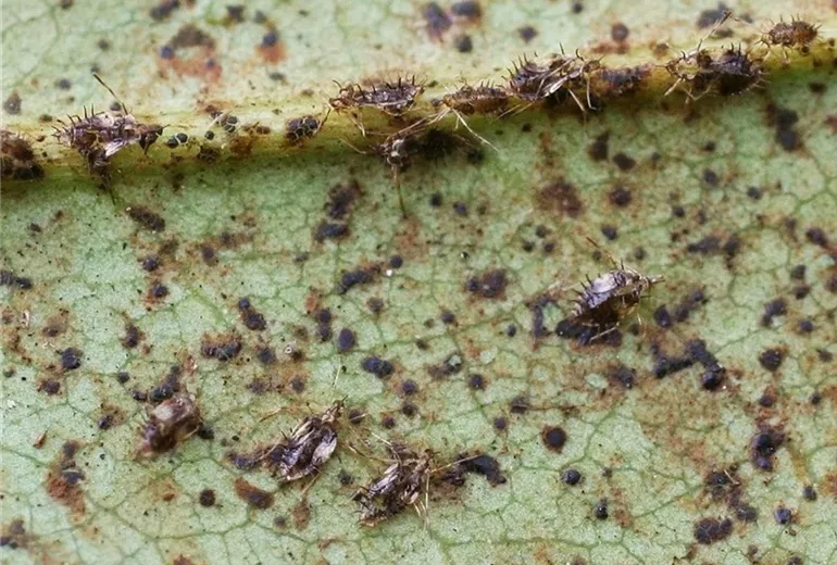 Die Blätter zeigen feine Sprenkelungen, die bei stärkerem Befall das Blatt verbräunen lassen. Die Blattunterseiten erscheinen "rostartig" und man findet schwarze, lackartige Kottröpfchen des Schädlings. Mit Hilfe einer Lupe lassen sich oft auch noch Larvenhäute oder die erwachsenen Wanzen finden.