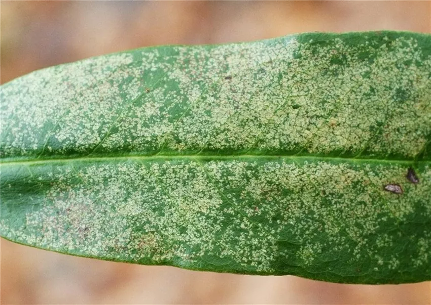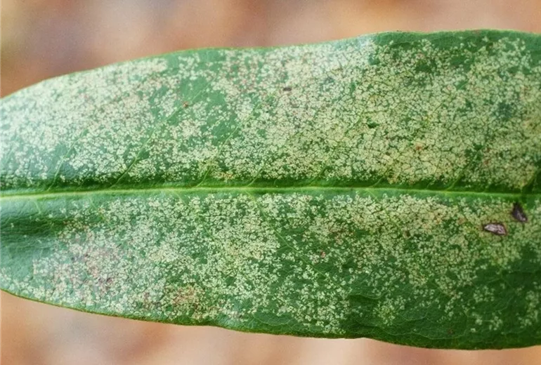 Die Rhododendronhaut- oder Netzwanzen (Stephanitis rhododendri) und ihre Larven saugen mit ihrem langen Stechrüssel an den Blättern. Ab Mitte Mai schlüpfen die Larven aus den Eiern, die zwischen August und Oktober des Vorjahres von den erwachsenen Wanzen gelegt wurden.
