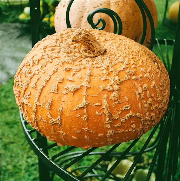 Der Kürbis 'Galeux d`Eysine' (Cucurbita maxima) bildet Früchte, die aromatisch schmecken und bereits ab September geerntet werden können. Für das optimale Wachstum des Kürbises 'Galeux d`Eysine' werden ein sonniger Standort und durchlässiger, nährstoffreicher Boden benötigt.