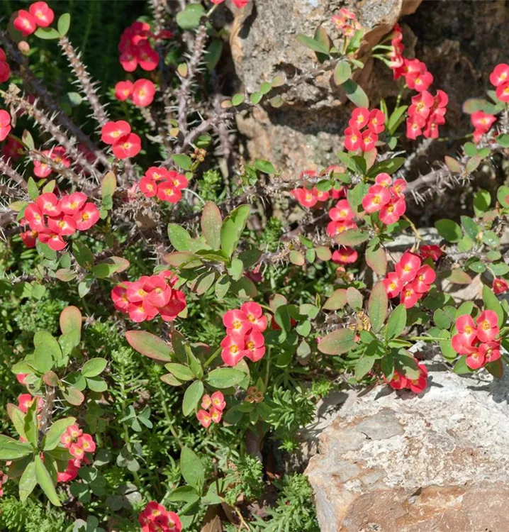 Der Christusdorn (Euphorbia milii) ist eine rot blühende Pflanze, die lanzettliche, mittelgrüne Blätter trägt. Seine tellerförmigen Blüten erscheinen in Trugdolden von November bis April. Diese kompakte und strauchartige Pflanze gedeiht am besten an einem sonnigen Standort.
