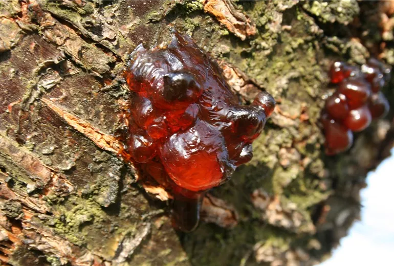 Gummifluß ist eine physiologische Reaktion der Pflanze, deren Ursache immer noch nicht genau geklärt ist. Feuchte Bodenverhältnisse, Verletzungen des Holzes und starker Rückschnitt fördern diese Erscheinung.