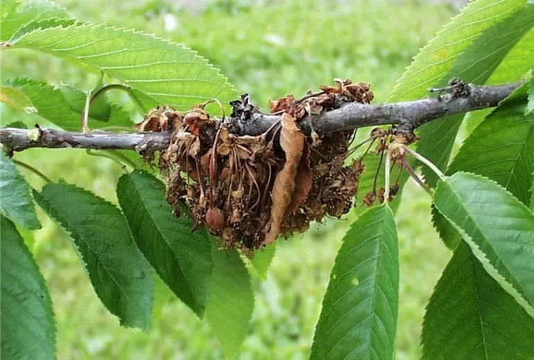 Ein Verkahlen der ganzen Krone, wie es bei Sauerkirsche beobachtet werden kann, findet i.d.R. nicht statt.