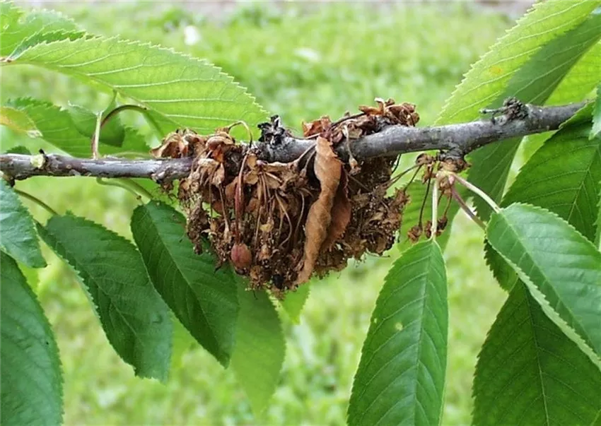 Die Monilia Spitzendürre tritt zwar hauptsächlich an Sauerkirschen auf, ist aber auch immer wieder an Süßkirschen zu beobachten. Nach normalem Austrieb wird plötzlich ein großer Teil der Blüten braun und stirbt ab. Bei der Süßkirsche trocknen in Folge des Blütenbefalls meist nur die Kurztriebe ein, an denen die Blütenbüschel sitzen.