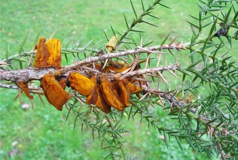 Der Wacholderblasenrost (Gymnosporangium sabinae) gehört zur Gruppe der Rostpilze. Besser bekannt ist er als Erreger des Birnengitterrosts. Auf gallertartigen Blasen bilden sich im Frühjahr Unmengen von Pilzsporen, die vom Wind auf Birnenblätter getragen werden und dort im Laufe des Sommers die auffällig orange bis rot gefärbten Flecke verursachen.