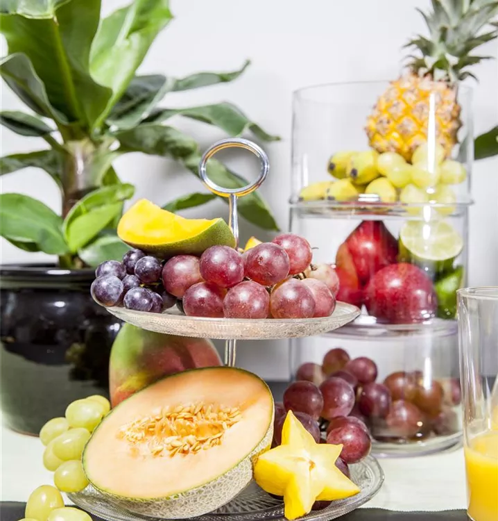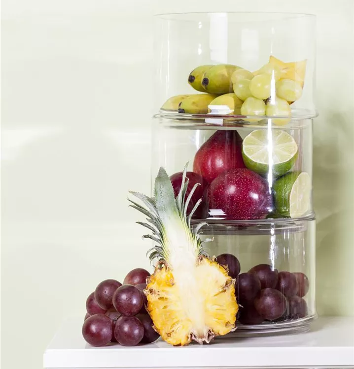 Ananas comosus bildet braun-gelbe Früchte mit einem süß-säuerlichen, exotischen Geschmack. Das gelbe Fruchtfleisch dieser ovalen Früchte ist saftig und faserig; die Fruchtschale ist rippig.