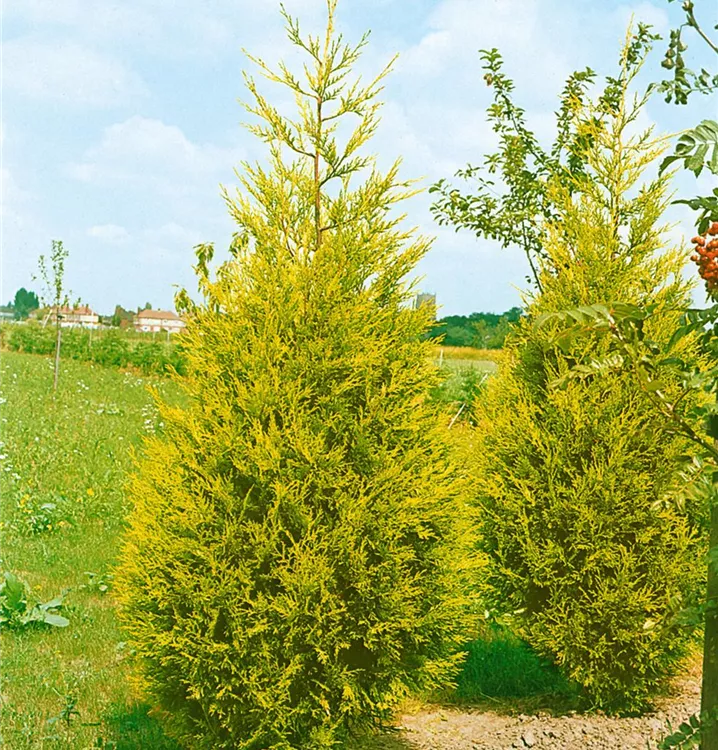 Gelbe Baumzypresse 'Castlewellan Gold' ist ein aufrecht und schlank wachsender Baum mit geschlossener Krone. Sie erreicht gewöhnlich eine Höhe von 7 - 15 m und wird ca. 2 - 3 m breit.